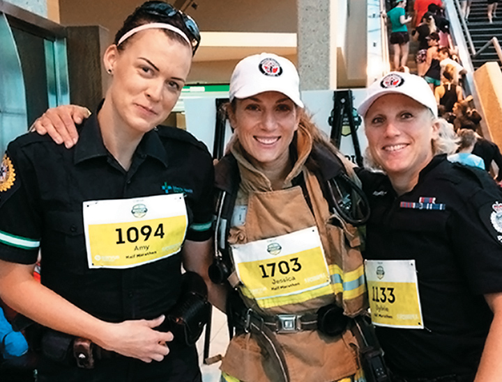 AHS EMS paramedic Amy Benson, far left, with firefighter Jessica LaMer and police officer Sylvie Boy, who ran a half-marathon for Wounded Warriors Canada in support of Canadian Armed Forces members, veterans, first responders and their families