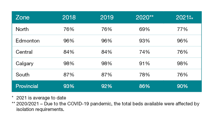 The table below shows the historical annual occupancy of beds in all five zones since 2018. AHS uses this information to monitor, manage, and adjust the number of beds across the province based on factors like – seasonality, the availability of health care workers and other emerging issues.